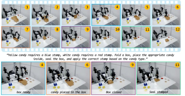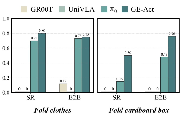 Accurate Execution Capability for Long-Horizon Tasks: More importantly, vision-centric modeling endows GE with powerful future spatiotemporal prediction capabilities. By explicitly modeling temporal evolution in the visual space, GE-Act can plan and execute complex tasks requiring long-term reasoning. In ultra-long-step tasks such as folding a cardboard box, GE-Act demonstrated performance far exceeding existing SOTA methods. Taking box folding as an example, this task requires the precise execution of over 10 consecutive sub-steps, each dependent on the accurate completion of the previous ones. GE-Act achieved a 76% success rate, while π0 (specifically optimized for deformable object manipulation) reached only 48%, and UniVLA and GR00T failed completely (0% success rate). This enhancement in long-horizon execution capability stems not only from GE’s visual world modeling but also benefits from the innovatively designed sparse memory module, which helps the robot selectively retain key historical information, maintaining precise contextual understanding in long-term tasks. By predicting future visual states, GE-Act can foresee the long-term consequences of actions, thereby generating more coherent and stable manipulation sequences. In comparison, language-space-based methods are prone to error accumulation and semantic drift in long-horizon tasks.