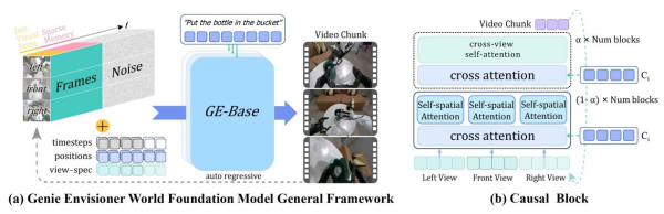 GE-Base: Multi-View Video World Foundation Model: GE-Base is the core foundation of the entire platform. It employs an autoregressive video generation framework, segmenting output into discrete video chunks, each containing N frames. The model’s key innovations lie in its multi-view generation capability and sparse memory mechanism. By simultaneously processing inputs from three viewpoints (head camera and two wrist cameras), GE-Base maintains spatial consistency and captures the complete manipulation scene. The sparse memory mechanism enhances long-term reasoning by randomly sampling historical frames, enabling the model to handle manipulation tasks lasting several minutes while maintaining temporal coherence.