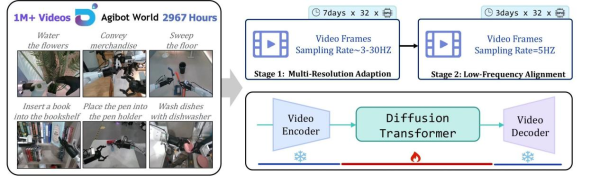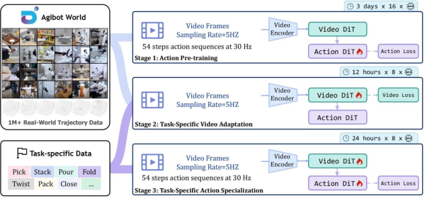 Training uses a two-stage strategy: first, temporal adaptation training (GE-Base-MR) with multi-resolution sampling at 3-30Hz makes the model robust to different motion speeds; subsequently, policy alignment fine-tuning (GE-Base-LF) at a fixed 5Hz sampling rate aligns with the temporal abstraction of downstream action modeling. The entire training was completed in about 10 days using 32 A100 GPUs on the AgiBot-World-Beta dataset, comprising approximately 3,000 hours and over 1 million real robot data instances.